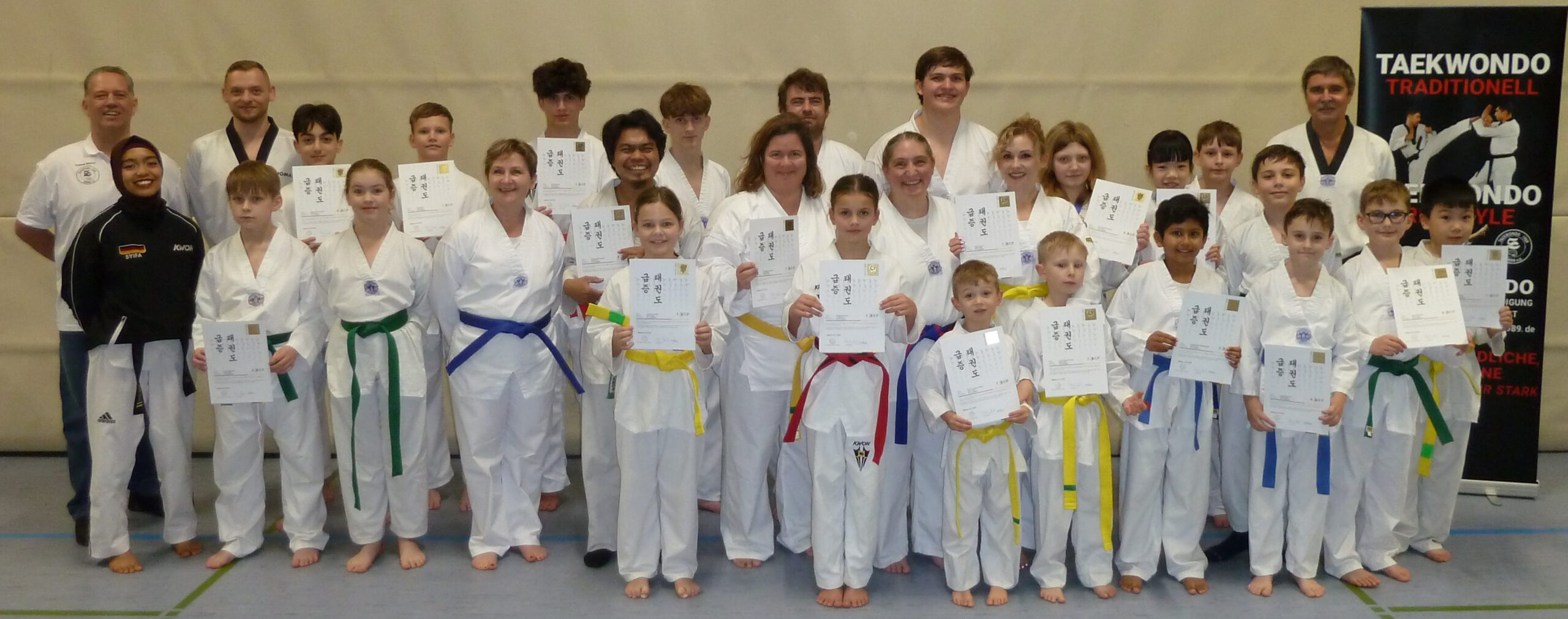 Ashley Heinrichs, Leo Chen, Geraldine Streule, Tom Beyer, Amelie De Rose, Till, Carl und Jana Weber konnten den Bundesprüfer der Deutschen Taekwondo Union, Frank Schulz, überzeugen und erlangten den 7. Kup (gelber Gürtel mit grünem Streifen).
